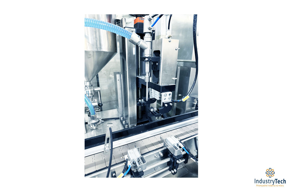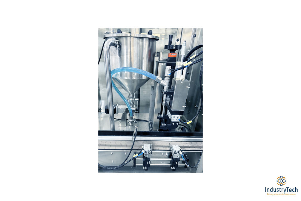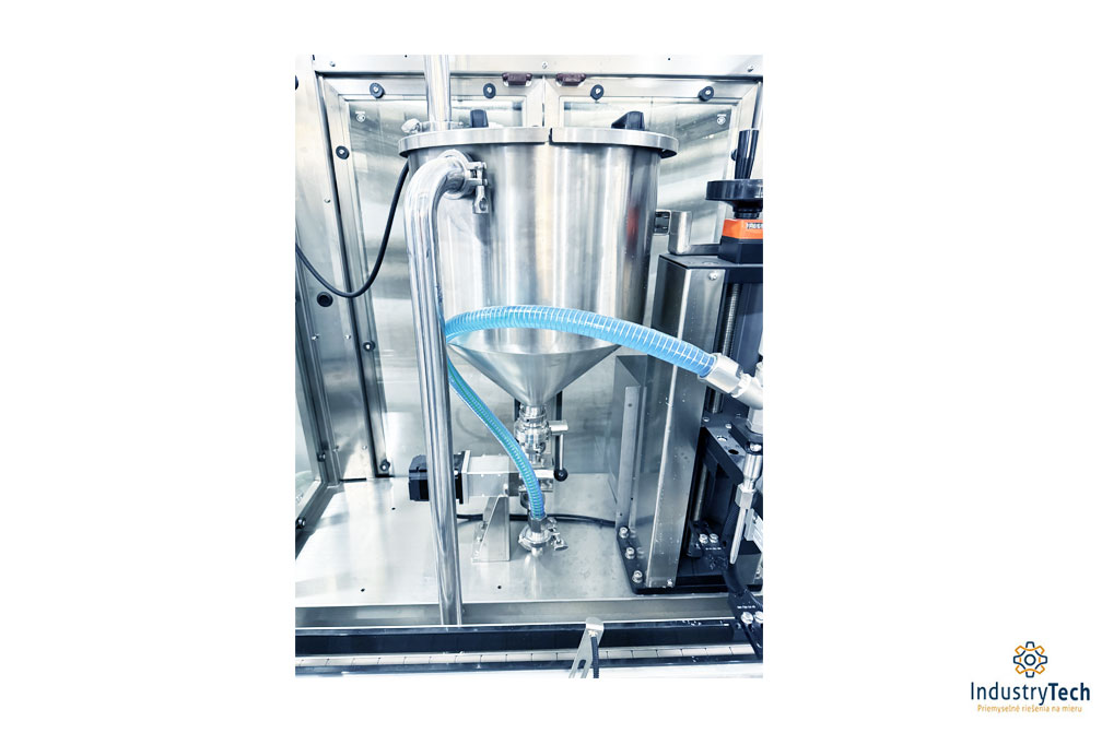 Pro automatické doplňování produktu používáme čerpadla a pumpy, které přečerpávají materiál z externí nádoby přímo do zásobníku. Hladinový snímač nepřetržitě sleduje množství produktu a zajišťuje stabilní plnění. Stroj pracuje s jednou dávkovací hlavicí s nastavitelným up & down systémem. Tryska se před plněním zasune ke dnu obalu a během dávkování se plynule zvedá.